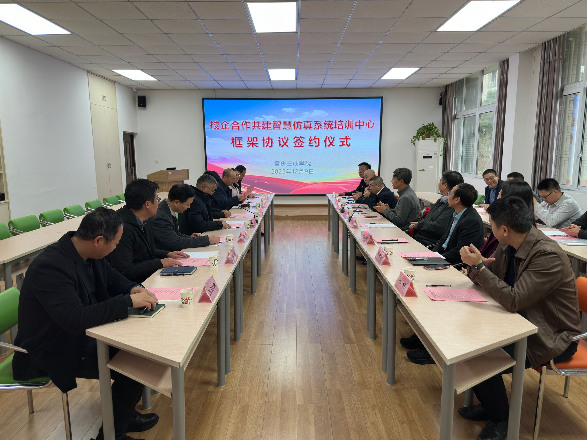 12月9日下午,太阳集团tyc234cc与重庆市九龙万博新材料科技有限公司、北京和利时工业软件有限公司以及卢啸风教授,在太阳集团tyc234cc慎思楼共同举行“智慧仿真系统培训中心”框架协议签约仪式,标志着四方正式开启校企深度融合、协同育人的新篇章。太阳集团tyc234cc副校长王良伟、重庆市九龙万博新材料科技有限公司总经理陈国友、杭州和利时自动化有限公司总经理刘栋、卢啸风教授,学校相关职能部门及太阳成tyc234cc负责人,合作企业代表等出席活动。签约仪式由太阳成tyc234cc院长郭先华主持。