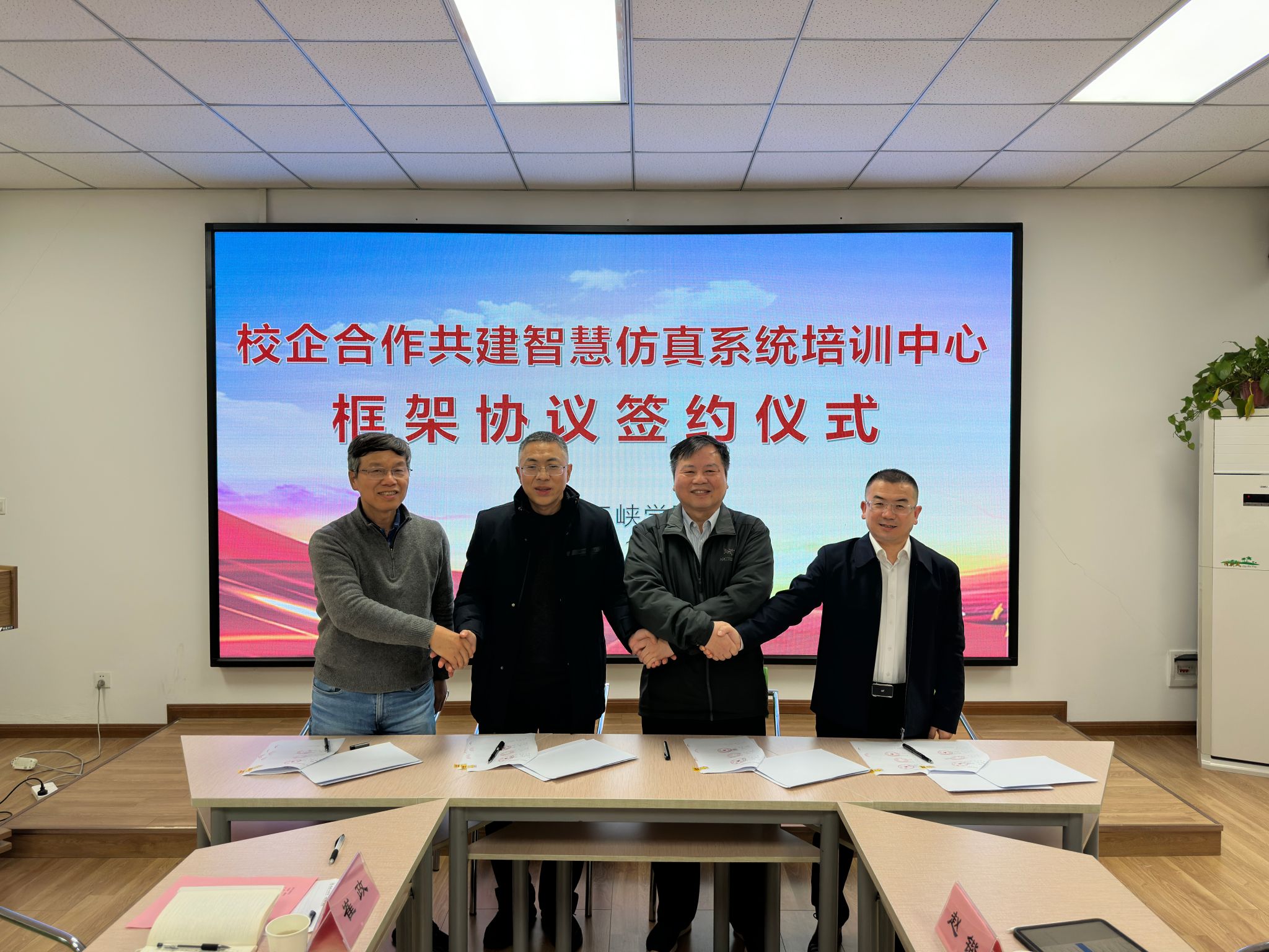 在与会人员的共同见证下,四方代表现场签署了合作框架协议并合影留念。根据协议,各方将围绕培训中心建设、课程开发、师资共建、技术研发与社会服务等方面开展深度合作,致力于打造一个技术先进、功能实用、运行高效的智慧仿真培训与研发平台。