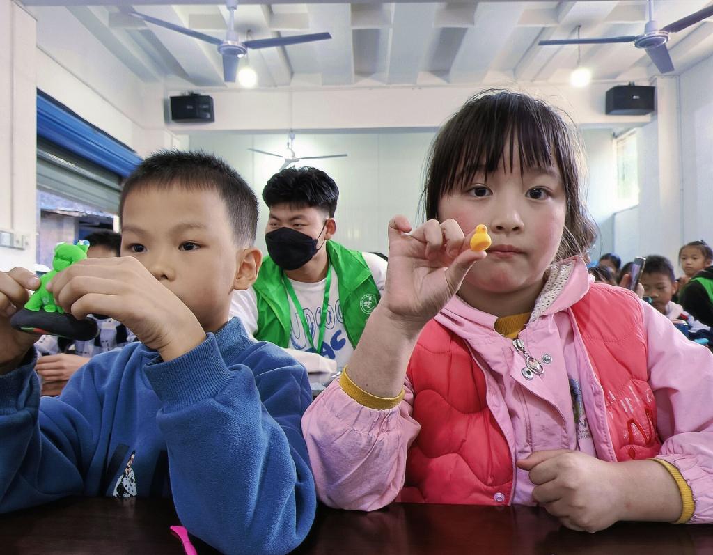 活动以“濒危物种”科普视频开始,引发小朋友对保护动物的思考;志愿者们展示了各类小动物的照片,并通过鼓励小朋友们模仿其叫声,来认识动物种类,并简要概括介绍了濒危的动植物;互动环节,罗胜男就如何保护生物多样性向小朋友们提问,大家积极发表自己的观点,主持人就保护方法进行了总结;活动结尾,小朋友使用橡皮泥制作动物模型并与志愿者们集体拍照合影留念。