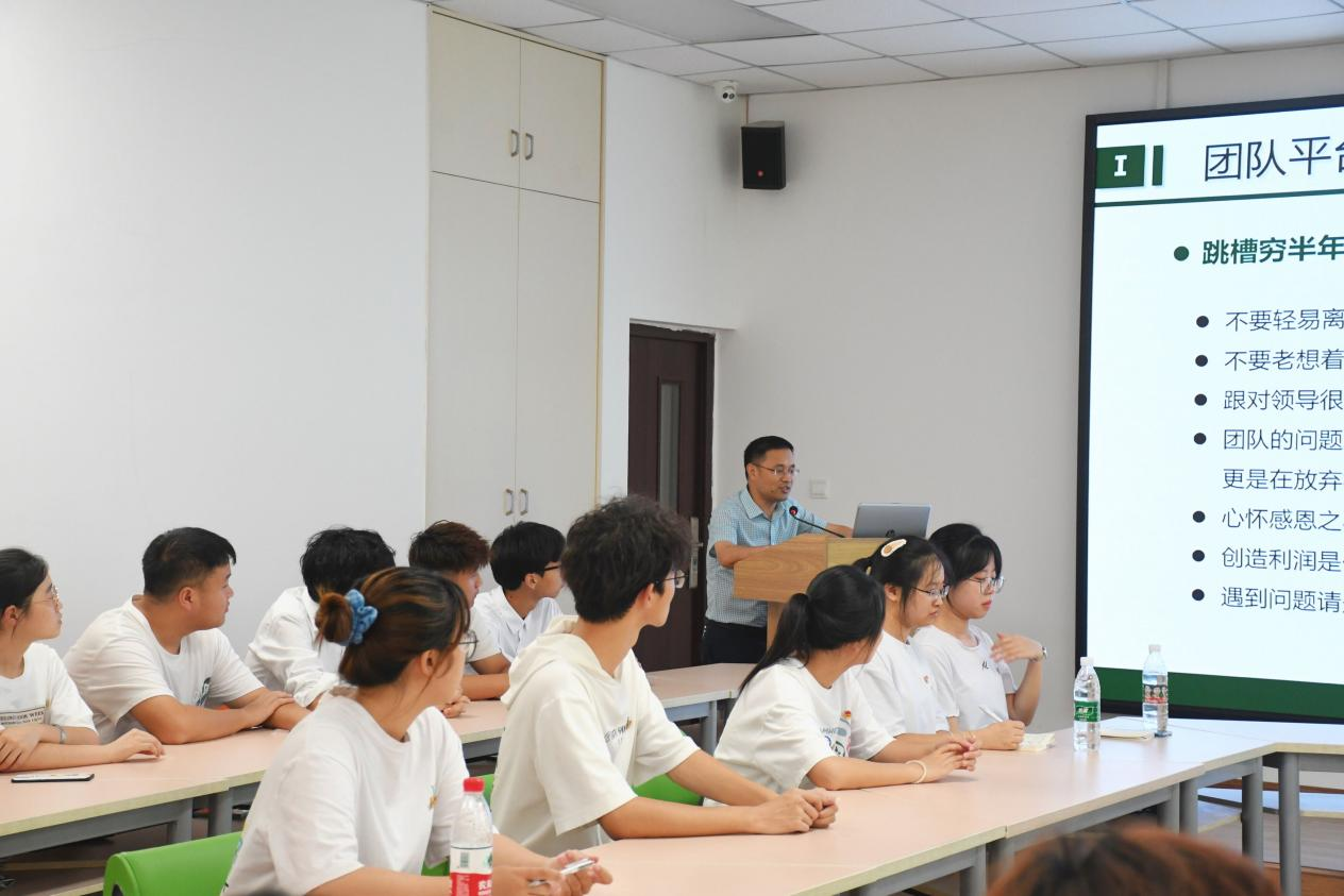 李廷真以“学会工作—做新时代有为青年”为主题,从团队平台、成果享受、经验心得三个方面展开,向团学骨干们强调了团队意识、大局意识、学会说话的重要性。他指出:团队能够做到的远超一个人的能力所及,要学会欣赏团队伙伴的优点,认可每个人的个性化特征,个人和团队是相互成就的,要学会解决问题而不是抱怨问题。他表示大学阶段是调整自己的过渡阶段,是寻找自己在社会中合适的位置,探索怎样为社会做贡献的阶段。他一方面鼓励团学骨干们多做尝试、提升眼界,另一方面也希望团学骨干们无论身处何方,都始终怀揣着一份对社会的担当,把自己的志向与社会需求结合起来。