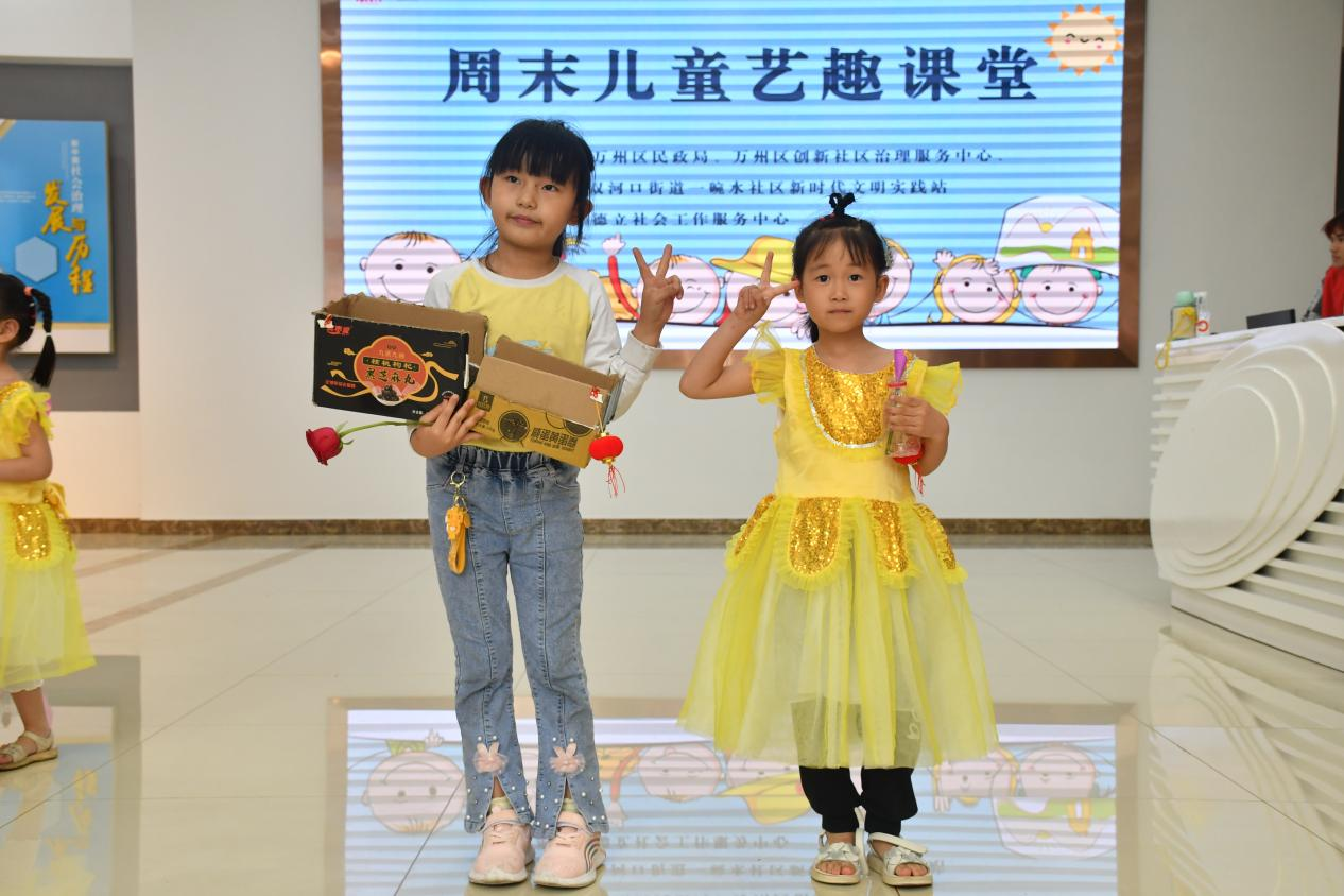 活动之前,工作人员王茀基带领志愿者们熟悉活动流程和注意事项。主持人白寒通过知识问答的方式引入主题,调动小朋友们的积极性。在志愿者的引导下,小朋友们发挥想象,将废纸盒、空塑料瓶等旧物进行改造,培养小朋友们的创造能力和动手能力,学会利用旧物,让小朋友们拥有保护地球的自豪感。志愿者们鼓励小朋友们站上讲台,介绍自己的作品并走秀展示,培养小朋友的语言表达能力,增强小朋友们的勇气。