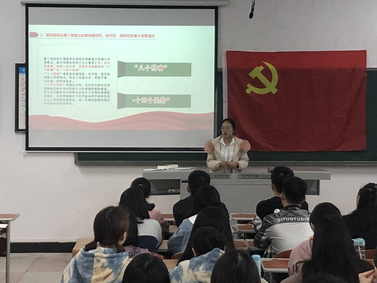 党课伊始,肖红以“什么是两学一做”引入本次的党课内容。随后肖红就习近平新时代中国特色社会主义思想的历史地位、发展背景、十九大报告重点内容展开课程,课程系统讲解了如何通过书籍《习近平谈治国理政》第三卷和学习强国app等方式怎样学习系列讲话,如何学习系列讲话等问题,肖红强调,学习要做到读原著、学原文、悟原理,全面系统学、深入思考学、联系实际学。