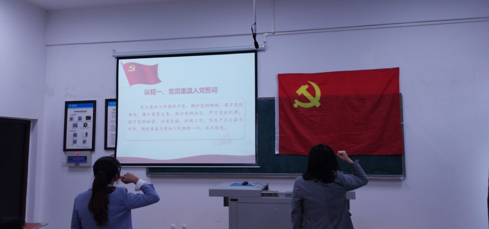 活动伊始,代小菊副书记带领党员同志重温入党誓词。接着,全体参会人员起立合唱《没有共产党就没有新中国》,退伍大学生上台合唱《强军战歌》。随后,在环化学院学生第二党支部纪检委员周才波同志的带领下,全体成员观看了《我和我的祖国》片段节选。观影结束,各参会人员积极举手发言,交流感受。其中,余冬梅同志发言说:“前人用汗水、生命向世界宣告我们站起来了,现在我们要奋勇向上、报效祖国,向世界宣告我们强起来了。”刘小云说道:“这是她第二次观看这个影片,但是她还是很激动。中国从最开始走到现在很不容易,就像影片里讲述升国旗的过程,虽然遇到了困难,但办法总比困难多,作为青年人我们要学习前辈们对国家的热爱之情,学习他们浴血奋战的精神,并运用到之后的学习中。”