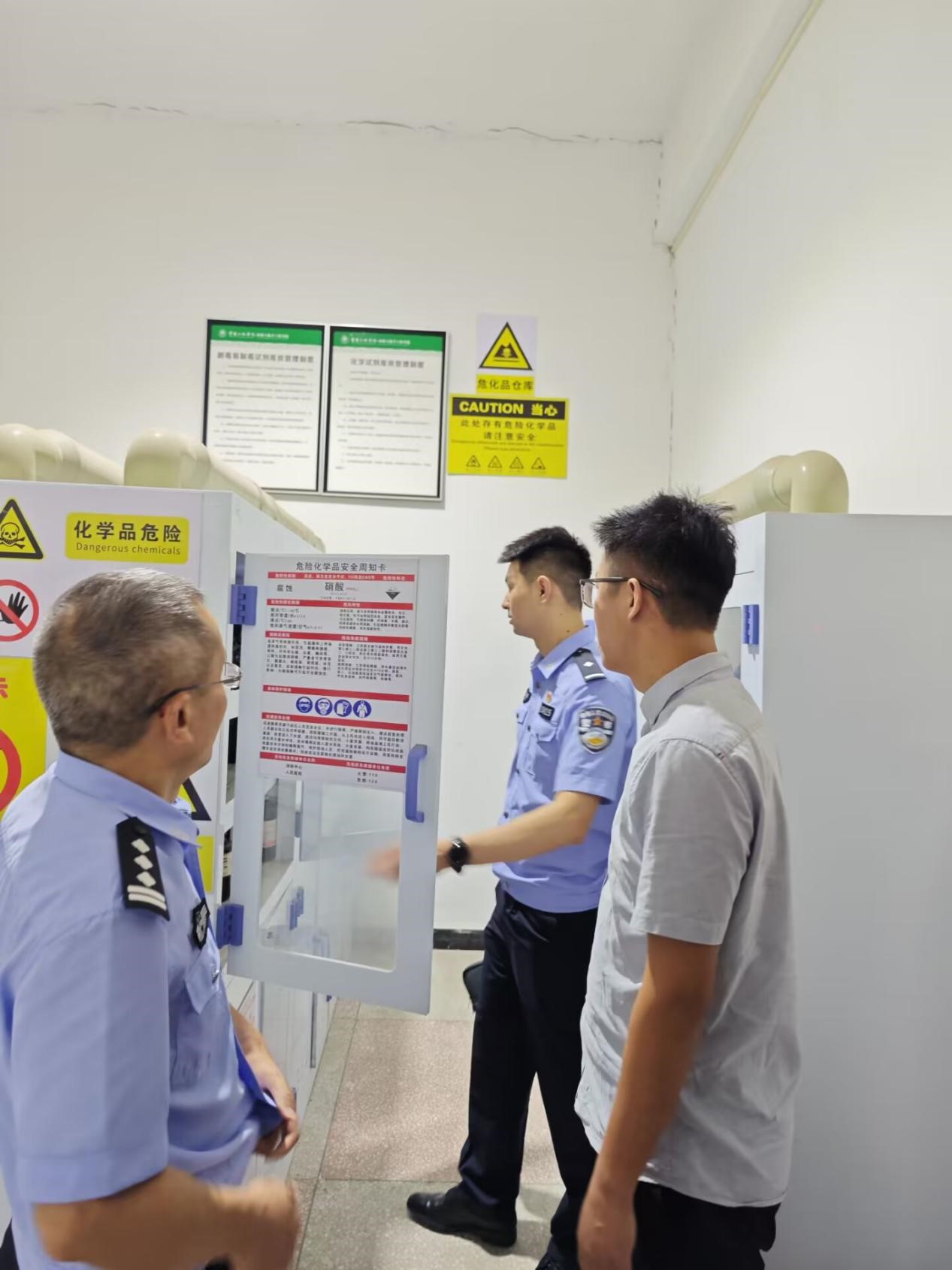 区公安局重点检查了易制毒、易制爆、剧毒等危险化学品的安全管理运行情况,并对药品的申请、使用流程及台账记录等进行了详细检查。