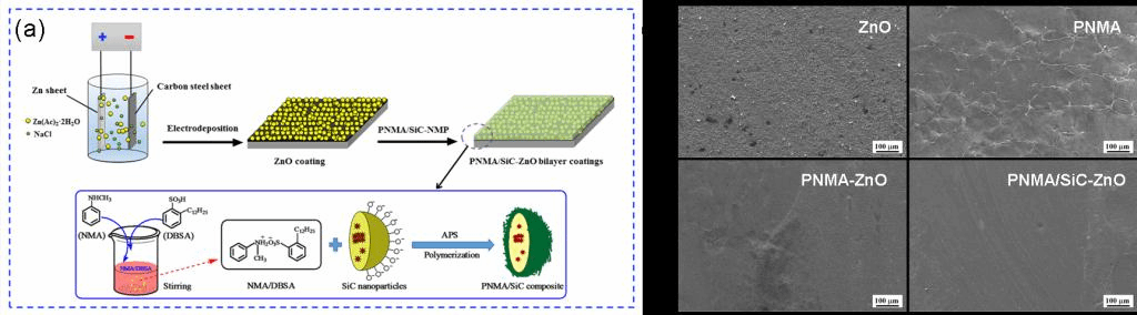 图1 (a) PNMA/SiC-ZnO涂层的制备示意图;(b)不同涂层表面的SEM图像