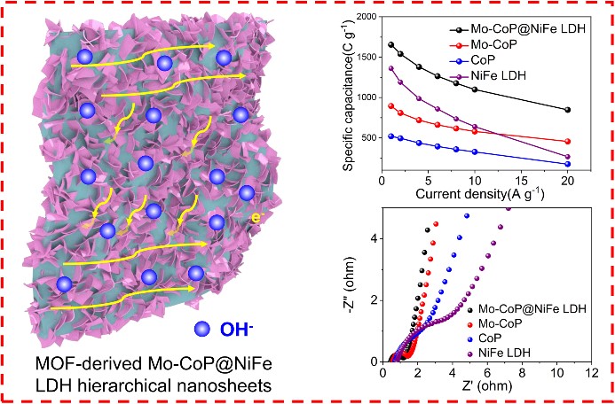 当前,能源短缺和环境污染日益成为当今人类面临经济社会发展的重要难题,大力发展可再生能源已经成为人们研究的热点。开发高效率和长期稳定的能量转换与存储器件是实现可再生能源利用的关键技术之一。采用物质复合和构型设计的策略构筑具有分级结构的复合纳米片电极,所制备的电极展现出优异的电化学性能,为开发高性能超级电容器电极材料提供重要借鉴。该成果以“MOF-derived Mo-CoP@NiFe LDH hierarchical nanosheets for high-performance hybrid supercapacitors”为题发表在《Journal of Alloys and Compounds》期刊上(https://doi.org/10.1016/j.jallcom.2022.165842),该文的第一作者是我院青年教师陈星老师。(材料分析与应用微信公众号推送:https://mp.weixin.qq.com/s/bdFfhqEwWqKnLE7VmNCIJw)