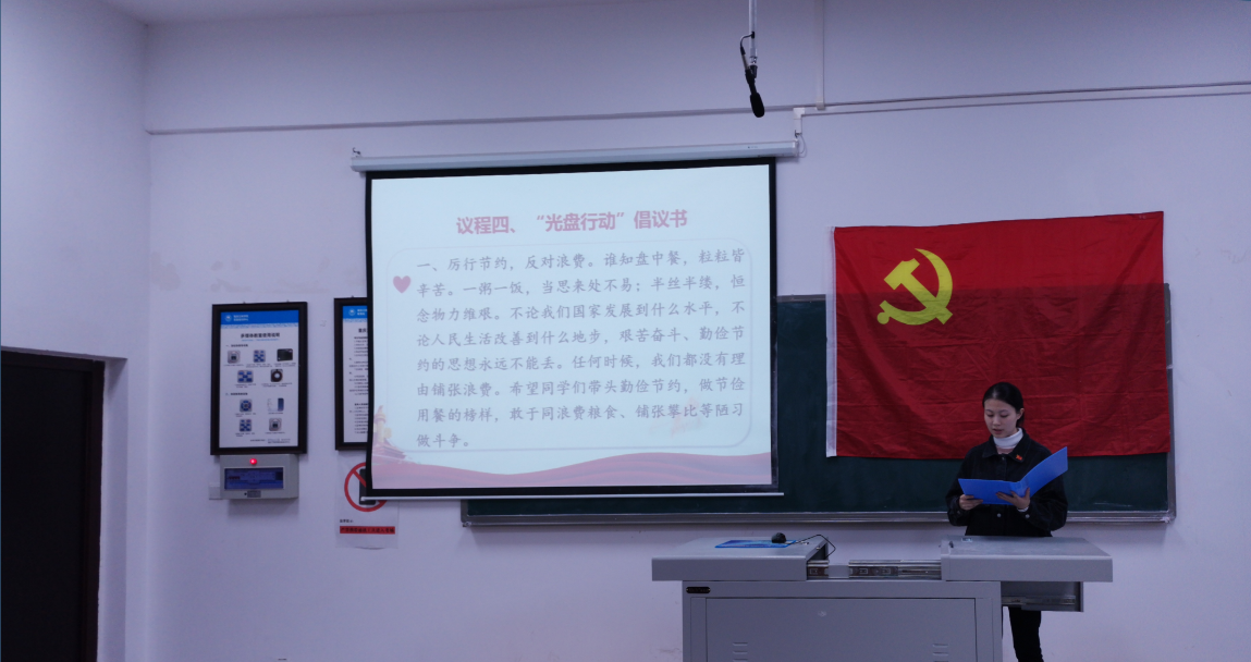 会上,党总支副书记代小菊老师首先带领大家一起学习了习总书记关于厉行节约 、反对浪费的重要批示要求,随后学生第二党支部书记肖红同志领学了“厉行节约,反对浪费,做绿色最美三峡学子”的倡议书。她提到,本次活动的目的是大力弘扬中华民族勤俭节约的优良传统,树立节约光荣、浪费可耻的思想观念,使勤俭节约、反对浪费成为学生的行为习惯和生活方式。然后,倪琪同志带领全体成员朗读光盘行动倡议书。朗读完毕后,参会人员纷纷表示,此次活动的举办,明确了光盘行动的概念和宗旨,理解了光盘行动的意义。