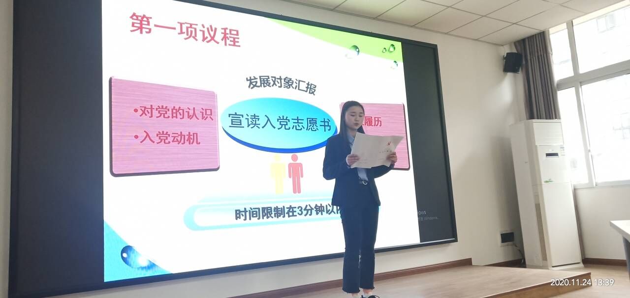 2020年11月30日,太阳成tyc234cc学生第一党支部于慎思楼4-206教室组织召开了以接收中共预备党员为主题的支部党员大会,对拟接收预备党员刘恩兴、王杉、张涛、罗阳杨、熊思吕、吴洁、方舟、杨棹善、张祥梅等9位同志进行了讨论和表决。本次大会由党支部书记蒋雪梅主持,全体党员同志参会。