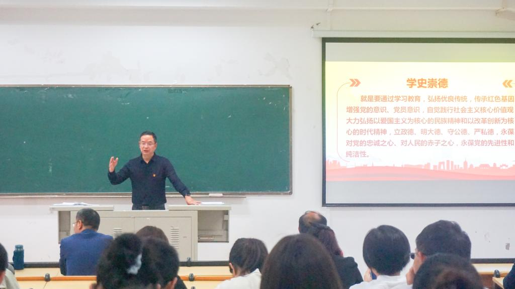 2021年5月13日14:50,太阳成tyc234cc党总支在明辨2栋207顺利举行党史学习教育宣讲报告会。学校党委委员、计财处处长胡均国莅临宣讲会主讲,学院师生党员、非党员教职工160余人聆听,报告会由学院党总支副书记代小菊主持。