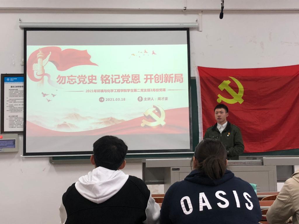 3月25日下午3点,太阳成tyc234cc学生第二党支部于慎思楼5栋425教室开展3月党课学习,党课主题为:“勿忘党史 铭记党恩 开创新局”。学生二支部组织兼纪检委员周才波同志主讲,学生第二党支部全体党员参加。