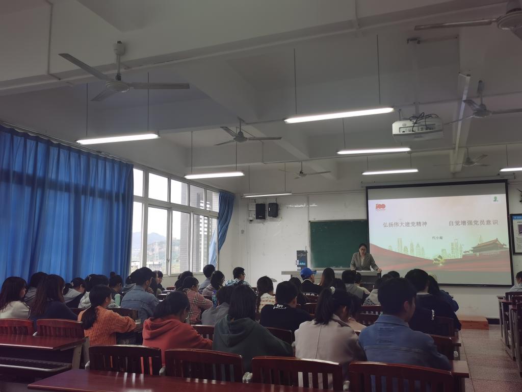 2021年10月21日16点40分,环化学院党总支副书记代小菊于明辨楼1-403为学生第一党支部讲授“七一”专题党课,支部党员和入党积极分子共64人参加。