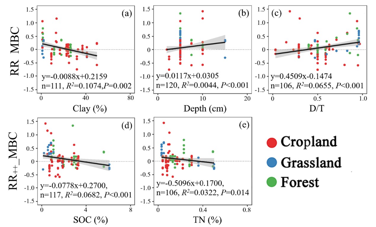除此之外,研究还发现MBC效应大小与土壤粘粒含量、有机碳、全氮呈负相关,与土壤采样深度和DWC干燥天数占总天数的比例呈正相关。