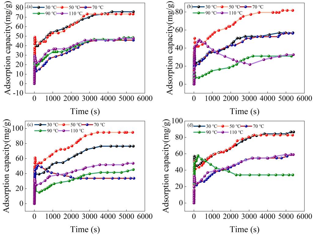 从图1可以看到原污泥生物炭(RSB)和K2FeO4+壳聚糖(CTS)调理后热解制备的生物炭(K2FeO4-CTS-B)在捕集温度为30℃拥有最大CO2容量,75.69mg/g和86.56mg/g;K2FeO4调理污泥后制备的生物炭(K2FeO4-B)和K2FeO4+阳离子聚丙烯酰胺调理后制备的生物炭(K2FeO4-CPAM-B)在捕集温度为50℃拥有最大CO2容量,81.68mg/g和94.81mg/g。