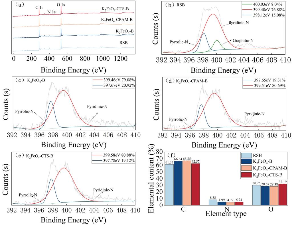 由图3(a)可知,280.00,399.00,530.00 eV附近结合能对应的C、N、O三种元素的吸收峰。图3(a)中发现K2FeO4-B、K2FeO4-CPAM-B、K2FeO4-CTS-B并没有出现新的元素峰,说明破解剂和絮凝剂的加入并没有引入新的元素,但是C、N、O三种主要元素的含量发生了变化,如图3(f)所示。由图3(f)可知,加入K2FeO4后,生物炭表面的C元素含量增加,O和N的含量有所下降;加入K2FeO4+CPAM后生物炭表面的C元素含量增加,O和N的含量有所下降,加入K2FeO4+CTS后生物炭表面的C元素含量下降,O和N的含量有所上升。碳含量高可以增加CO2与生物体之间的伦敦色散力,这有助于CO2的捕集,过量的O含量也有助于生物炭捕获CO2,N部分和基于N的官能团也在创建路易斯碱性位点和诱导电子结构变化中发挥作用,增强酸性CO2和碱性N之间的相互作用。图3的其余图可知,400.7±0.3、399.2±0.3和398.5±0.3 eV,分别归因于石墨氮、吡咯氮和吡啶氮,高CO2吸附的情况下,吡咯氮比吡啶氮和石墨氮更活跃,加入K2FeO4后生物炭表面未出现石墨氮,吡咯氮的含量上升,加入K2FeO4+CPAM以及K2FeO4+CTS后,生物炭表面的吡咯氮含量继续上升,导致他们的CO2捕集能力提高。