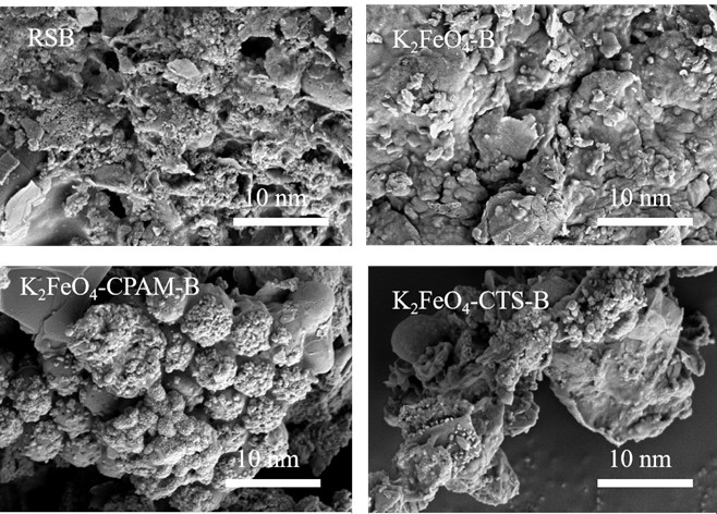 从图2可以观察到K2FeO4调理后的污泥生物炭表面粗糙度降低,有团聚体出现,这可能是由于K2FeO4在水中水解之后生成的铁氧化物在生物炭表面起到了聚集作用。加入CPAM和CTS后表面粗糙度进一步降低,可以看到CPAM调理后有少量丝状物出现,而CTS调理后的生物炭表面则可以看到表面孔隙被覆盖。因此推测加入调理剂和絮凝剂后并未使生物炭表面积增加。