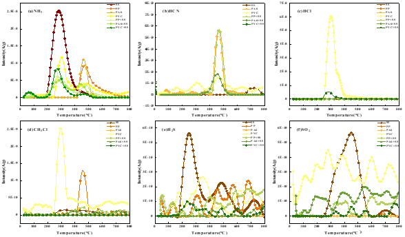 从图1可以看出,在含N/S/Cl的主要释放气体中,PP、PA6和PVC均抑制NH3、CH3Cl、H2S和SO2的释放,但PA6增加了HCN的释放风险,PVC增加了HCl的释放,这是由于PA6和PVC本身存在N杂原子和Cl杂原子。三种塑料的加入减少了污泥热解过程中NH3、CH3Cl、H2S和SO2污染气体的释放。由于酰胺基团的存在,PA6促进HCN气体的释放。同时,PVC中含有Cl-,促进HCl气体的释放。综上所述,对于没有污染元素的塑料,在污泥热解过程中可以减少部分含N/S/Cl气体的释放。但是,当塑料含有污染元素时,应注意其自身污染元素对气体释放的影响