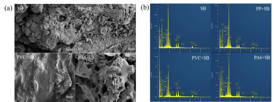 由图3(a)可以看出,污泥生炭表面粗糙,颗粒形状不规则,具有多孔结构。塑料的生物炭表面都表现出不同程度的堵塞结构,这可能是由于塑料在高温下熔化,从而包裹了生物炭。PP+SB表面有块状结构并伴有网状结构,孔隙较少,部分有表面光滑、颗粒突出的特征。PVC+SB表面大多光滑呈堵塞结构,比表面积降低使其挥发性物质的含量减少。这可能是因为污泥中的金属氧化物与氯离子相互反应使氯元素吸附在生物炭上。从生物炭的EDS能谱(如图3(b)所示)来看,PVC+SB表面含有K、Na和Ca等金属元素,与之反应生成了氯化合物。PA6污泥生物炭表面有少量熔融现象,且孔隙结构丰富,具有局部大孔和致密的不均匀结构,这可能是由于PA6塑料在热处理过程中与污泥相互作用,产生较多挥发性气体所致。因此,PP和PA6塑料丰富了生物炭的孔隙结构和表面特性,而PVC则降低了孔隙结构抑制了气体的逸出。