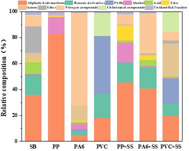 图2为样品中热解油的分类和含量,PP的补氢和脱氧促进了污泥中更多脂肪烃和醇的形成,PP和PA6在一定程度上抑制了含氮化合物和含氯化合物的释放,提高了热解油的热值和稳定性。聚氯乙烯抑制了污泥中脂肪族碳氢化合物的形成,增加了多环芳烃和含氯化合物的产生,降低了热解油的利用率。不同塑料对SS热解产物油的影响不同,PP和PA6在不同程度上提高了焦油的利用率,而PVC则抑制了油的利用率。