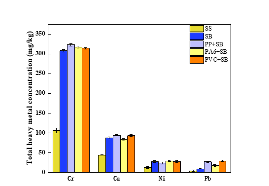 图4为生物炭的重金属含量。生物炭样品中所有重金属的浓度均未超过国家标准GB/T 23486-2009的阈值(Cr:1000 mg/kg、Cu:1500 mg/kg、Ni:200 mg/kg、Pb:1000 mg/kg),表明所有塑料生物炭对环境的危害较。在PP+SB、PA6+SB和PVC+SB中,重金属铬和铅的浓度略高于SB,这表明在PP、PA6和PVC的存在下,铬和铅可以被固定,这可能是因为热解可冷凝和不可冷凝气体的增加降低了生物炭的产量,从而增加了铬和铅的浓度。与SB相比,PVC的加入降低了生物炭中铜重金属的含量。研究表明,PVC可通过释放Cl2和HCl与污泥中的重金属Cu反应生成挥发性氯化物,从而降低生物炭中的Cu浓度。