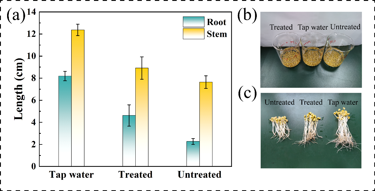 研究中选用黄豆芽作为受试生物对降解后CIP溶液进行毒性评价。实验中记录了每种溶液中豆芽的根和茎的生长数据。如图3所示,观察豆芽在三种不同溶液(自来水、CIP溶液和降解后的CIP溶液)中的生长情况并记录数据。豆芽用自来水培育时,根和茎的平均长度为8.19 cm和12.37 cm。相比之下,CIP培育的豆芽生长受到明显的抑制,根和茎的长度分别为2.27 cm和7.64 cm。在降解后的CIP溶液中黄豆芽根和茎的平均长度分别为4.62 cm和8.92 cm。这表明降解后的CIP毒性得到降低。