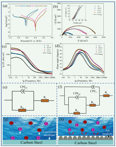 在防腐蚀性能上,相比裸钢,E - CA涂层的腐蚀电位从- 650.9 mV正移至- 394.0 mV,腐蚀电流密度从110.2 µA/cm2降至1.5 µA/cm2,保护效率高达98.6%。从电化学阻抗谱(EIS)来看,其电容弧直径显著大于其他涂层,在0.01Hz处的阻抗模量值最高,电荷转移电阻达到最大,表明该涂层能有效阻止腐蚀介质侵蚀,为金属基体提供强力保护。这主要归因为粗糙表面储存的空气能够有效抑制腐蚀介质的浸入,另外,涂覆在钢基体上的Ag-羧酸盐络合物大大增强了涂层的阻隔效果,提高了E-CA的腐蚀防护能力。