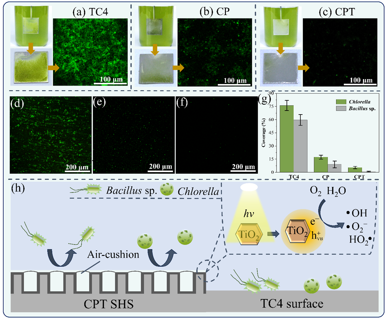 图3 小球藻在(a) TC4,(b) CP和(c) CPT上的光学和CLSM图像。芽孢杆菌在(d) TC4,(e) CP和(f) CPT上的CLSM图像。(g)小球藻和芽孢杆菌覆盖率。(h)抗生物污损机理。