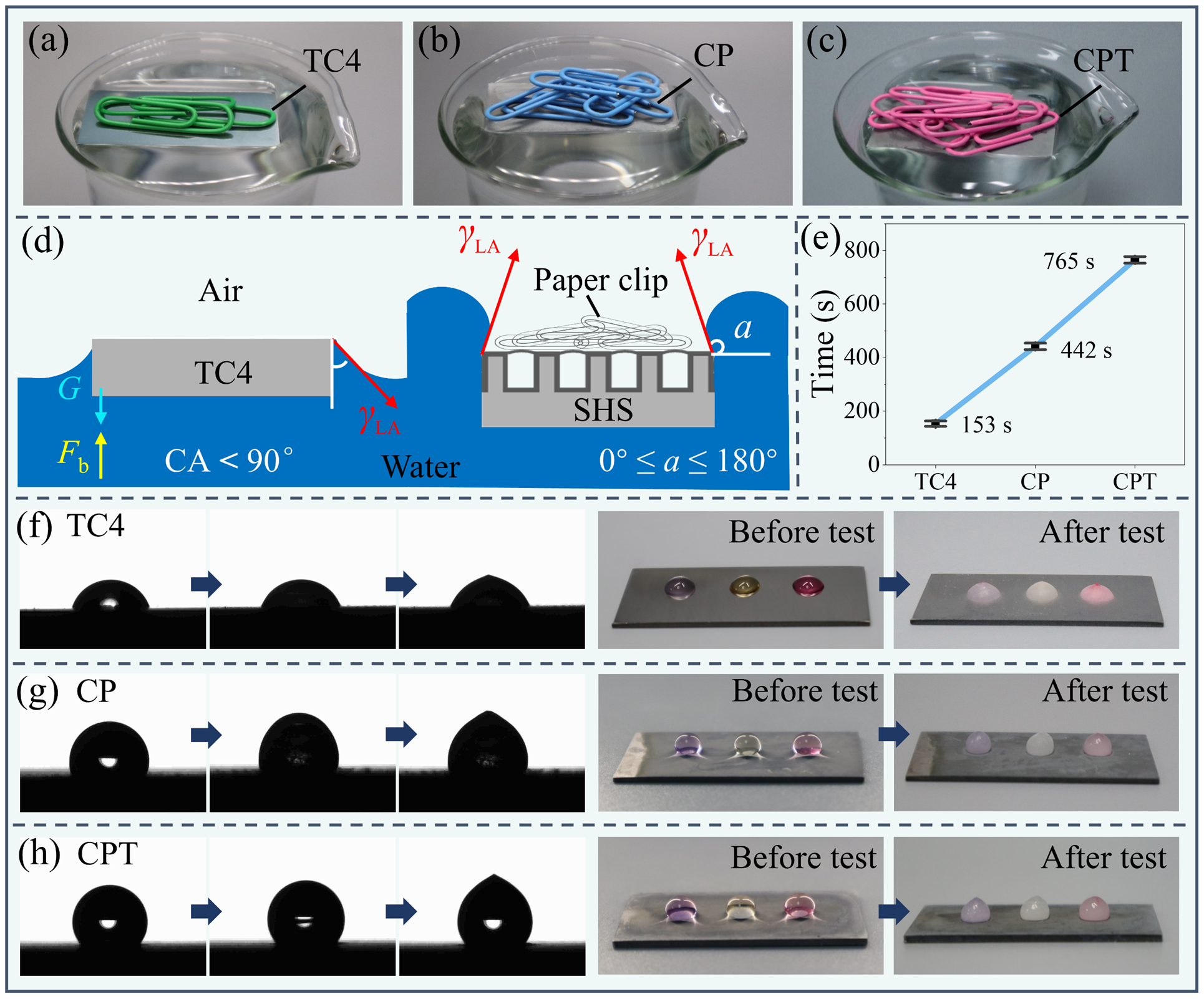 图2 浮力和防冰试验。(a, f) TC4;(b, g) CP;(c, h) CPT。(d)浮力试验模型。(e)−10 ℃时,水滴在制备表面上的冻结时间