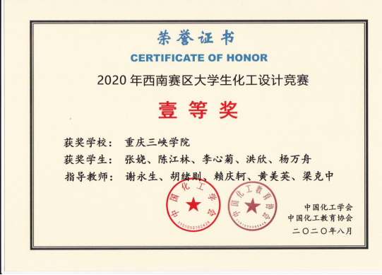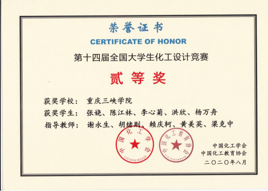近日,环化学院“烷戊生辉”团队在2020年第十四届全国大学生化工设计竞赛中喜获西南赛区一等奖、全国二等奖佳绩。
