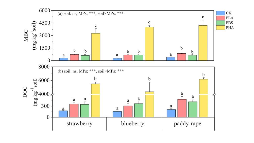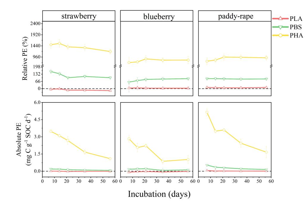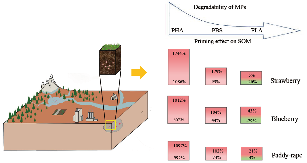 微塑料(MPs)由于其普遍存在和持久性有可能导致环境和人类健康风险,特别是在农田土壤中的。可降解MPs可通过激发效应(priming effect, PE)显著改变土壤有机碳的分解。然而,可降解MPs对农田土壤有机质分解的PE幅度和方向仍不确定。我们通过在草莓、蓝莓和水稻-油菜轮作种植的三种农田土壤中分别添加聚羟基烷酸酯(PHA)、聚丁二酸丁二酯(PBS)和聚乳酸(PLA)三种可降解MPs,并设置22˚C进行56天室内培养实验来解决这一问题。利用天然13C同位素示踪技术区分可降解MPs和土壤有机碳来源碳,结合二元混合模型探讨不同微塑料诱导的土壤有机碳分解的PE差异。