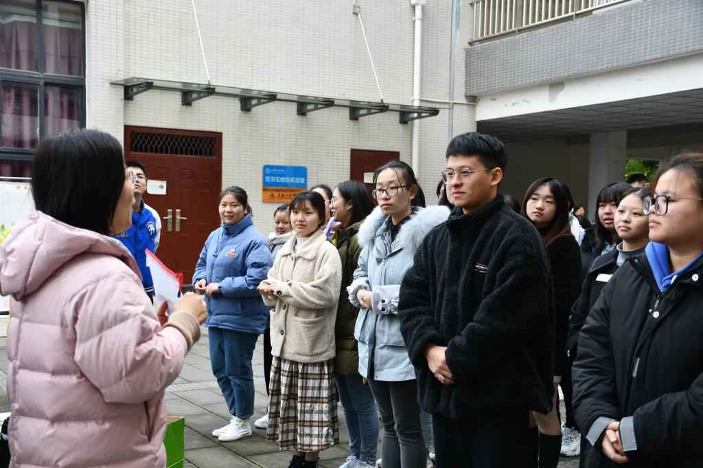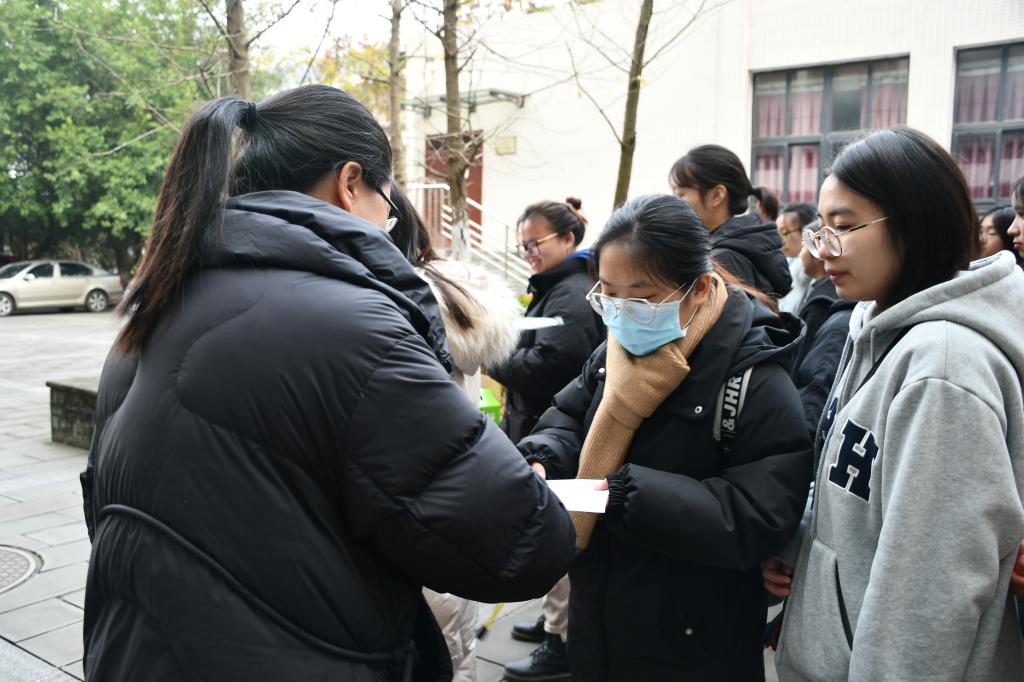 2021年12月3日9:00,太阳成tyc234cc在明辨4栋前面的广场举行2022届考研学子慰问活动。学院党总支书记谢昆、党总支副书记代小菊、学工办副主任周强为143名考研学子加油打气,送上温暖祝福。