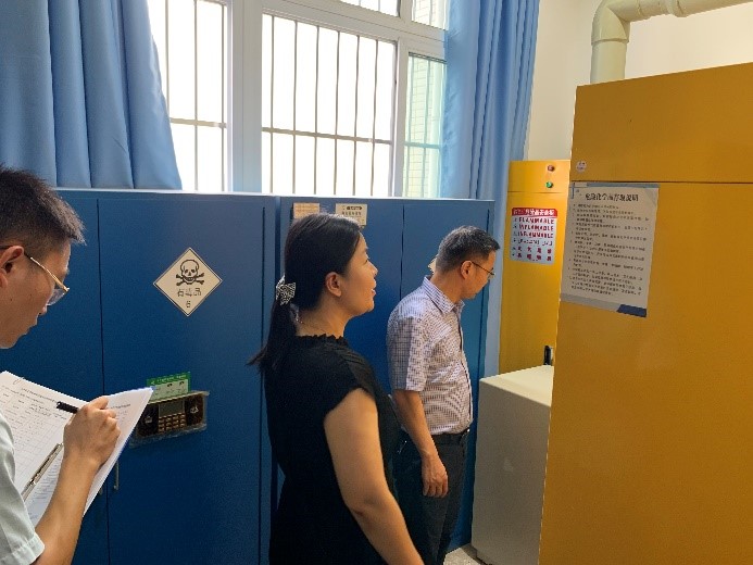 7月16日下午,学院领导班子成员一行对市级重点实验室、化学化工实验教学示范中心、环境工程实验室等场所进行安全大检查,重点查看了实验室化学品安全、仪器设备安全、水电安全、实验场所安全、消防安全等方面,要求实验室有关人员在假期期间提高警惕,严格执行值班制度,定期排查安全隐患,同时要做好暑期留校学生在实验室的安全管理,确保实验室暑期安全平稳运行。